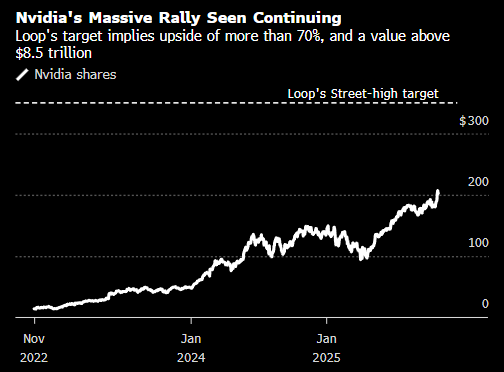 loopcapitalmarkets周一将英伟达目标股价从250美元上调至350美元,为华尔街当前最高预测。这一新目标相较于英伟达最新收盘价202.49美元高出逾70%,对应的市值将超过8.5万亿美元。当前市场对英伟达的平均目标价为231美元。